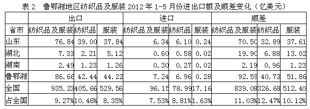 我國魯鄂湘三省2012年1-5月份紡織品及服裝出口額為86.66億美元,占全國紡織品服裝出口總額的9.27%,其中紡織品出口額為42.44億美元,占全國10.46%,服裝出口額為44.22億美元,占全國8.35%;在進口方面,魯鄂湘三省紡織品及服裝進口額為7.24億美元,占全國紡織品服裝進口總額的7.53%,其中紡織品進口額為6.96億美元,占全國8.81%,服裝進口額為0.28億美元,占全國1.63%;顯示我國魯鄂湘地區(qū)紡織品服裝出口總額遠高于進口總額,順差明顯,表明該地區(qū)紡織品服裝在國際市場上競爭力較強。
