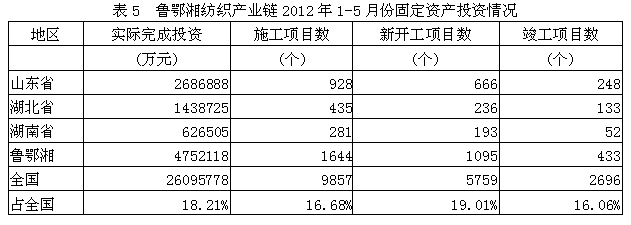 據(jù)國家統(tǒng)計局公布的數(shù)據(jù),2012年1-5月份魯鄂湘地區(qū)紡織產(chǎn)業(yè)鏈實際完成投資額475.21億元,占全國實際投資總額的18.21%;當年以來到目前為止施工項目總數(shù)為1644個,占全國施工總數(shù)的16.68%;其中新開工項目數(shù)1095個,占全國新開工項目總數(shù)的19.01%;截至5月底為止,已實現(xiàn)竣工項目數(shù)433個,占全國已竣工項目總數(shù)的16.06%,占該地區(qū)施工項目總數(shù)的26.34%,表明該地區(qū)投資項目進展較好。