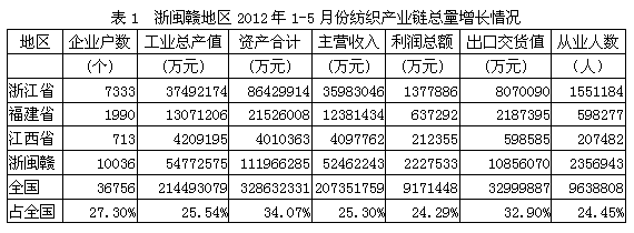 據(jù)國家統(tǒng)計局公布的數(shù)據(jù),2012年1-5月份我國浙閩贛三?。ㄕ憬 ⒏=ㄊ ⒔魇。┘徔棶a(chǎn)業(yè)鏈(從紡織上游原料到下游服裝)規(guī)模以上企業(yè)數(shù)量為10036家,占全國總數(shù)的27.30%;工業(yè)總產(chǎn)值為5477.26億元,占25.54%;資產(chǎn)合計為11196.63億元,占34.07%;主營收入為5246.22億元,占25.30%;利潤總額為222.75億元,占24.29%;出口交貨值為1085.61億元,占32.90%;從業(yè)人數(shù)為235.69萬人,占24.45%。由此可見,浙閩贛地區(qū)紡織產(chǎn)業(yè)鏈總產(chǎn)值、總資產(chǎn)、主營收入、利潤總額、出口和就業(yè)均給全國作出了巨大的貢獻。