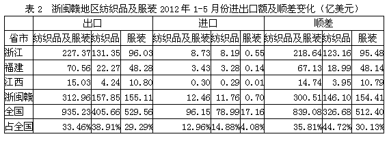 我國浙閩贛三省2012年1-5月份紡織品及服裝出口額為312.96億美元,占全國紡織品服裝出口總額的33.46%,其中紡織品出口額為157.85億美元,占全國38.91%,服裝出口額為155.11億美元,占全國29.29%;在進口方面,浙閩贛三省紡織品及服裝進口額為12.46億美元,占全國紡織品服裝進口總額的12.96%,其中紡織品進口額為11.76億美元,占全國14.88%,服裝進口額為0.70億美元,占全國4.08%;顯示我國浙閩贛地區(qū)紡織品服裝出口總額遠高于進口總額,順差明顯,表明該地區(qū)紡織品服裝在國際市場上競爭力較強。