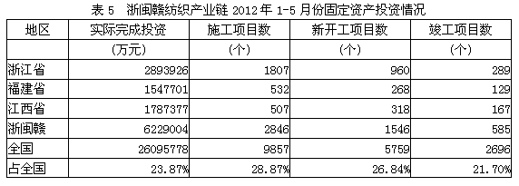據(jù)國家統(tǒng)計局公布的數(shù)據(jù),2012年1-5月份浙閩贛地區(qū)紡織產(chǎn)業(yè)鏈實際完成投資額622.90億元,占全國實際投資總額的23.87%;當(dāng)年以來到目前為止施工項目總數(shù)為2846個,占全國施工總數(shù)的28.87%;其中新開工項目數(shù)1546個,占全國新開工項目總數(shù)的26.84%;截至5月底為止,已實現(xiàn)竣工項目數(shù)585個,占全國已竣工項目總數(shù)的21.70%,占該地區(qū)施工項目總數(shù)的20.56%,表明該地區(qū)投資項目進展較好。
