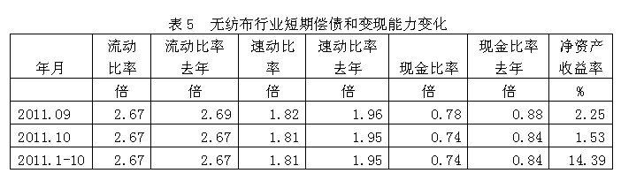 從短期償債和變現(xiàn)能力的變化看,無(wú)紡布行業(yè)流動(dòng)比率(流動(dòng)資產(chǎn)/流動(dòng)負(fù)債)2011年1-10月份為2.67倍,而上年同期為2.67倍,流動(dòng)比率較高,表明企業(yè)短期償債能力較強(qiáng);