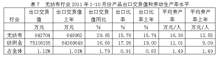從行業(yè)產(chǎn)品出口交貨值和勞動(dòng)生產(chǎn)率水平看,2011年1-10月份無(wú)紡布行業(yè)產(chǎn)品出口交貨值為84.27億元,占紡織全行業(yè)的1.12%;出口交貨值比上年同期增加29.85%;該行業(yè)產(chǎn)品出口比率(出口交貨值/工業(yè)銷售產(chǎn)值)為15.78%,而上年同期為15.74%,表明該行業(yè)產(chǎn)品出口狀況較好;從勞動(dòng)生產(chǎn)率的水平看,2011年1-10月份無(wú)紡布行業(yè)平均勞產(chǎn)率(工業(yè)增加值/從業(yè)人數(shù))為16.38萬(wàn)元/人,而上年同期為13.55萬(wàn)元/人,表明該行業(yè)勞動(dòng)生產(chǎn)率的實(shí)際水平較為理想。