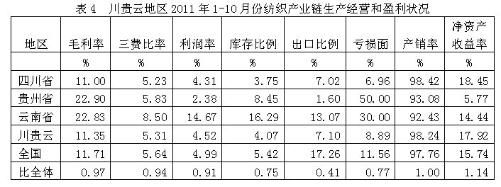 從生產(chǎn)經(jīng)營和盈利狀況看,川貴云紡織產(chǎn)業(yè)鏈毛利率2011年1-10月份為11.35%,為全國平均數(shù)的0.97倍,三費(fèi)比率(營業(yè)、管理和財(cái)務(wù)費(fèi)用率之和)為5.31%,為全國平均數(shù)的0.94倍,利潤率為4.52%,為全國平均數(shù)的0.91倍;庫存比率為4.07%,為全國平均數(shù)的0.75倍;出口比例為7.10%,為全國平均數(shù)的0.41倍;企業(yè)虧損面為8.89%,為全國平均數(shù)的0.77倍。由此可見,川貴云地區(qū)的盈利狀況接近于全國紡織產(chǎn)業(yè)鏈的平均水平。