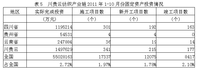 據(jù)國家統(tǒng)計(jì)局公布的數(shù)據(jù),2011年1-10月份川貴云地區(qū)紡織產(chǎn)業(yè)鏈實(shí)際完成投資額149.76億元,占全國實(shí)際投資總額的2.72%;當(dāng)年以來到目前為止施工項(xiàng)目總數(shù)為341個(gè),占全國施工總數(shù)的1.97%;其中新開工項(xiàng)目數(shù)215個(gè),占全國新開工項(xiàng)目總數(shù)的1.78%;截至10月底為止,已實(shí)現(xiàn)竣工項(xiàng)目數(shù)177個(gè),占全國已竣工項(xiàng)目總數(shù)的2.10%,占該地區(qū)施工項(xiàng)目總數(shù)的51.91%,表明該地區(qū)投資項(xiàng)目進(jìn)展較好。
