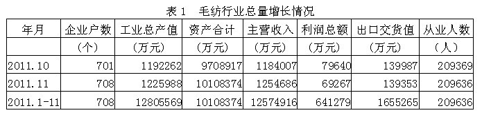 據(jù)國家統(tǒng)計局公布的數(shù)據(jù),2011年1-11月份我國規(guī)模以上毛紡行業(yè)企業(yè)數(shù)量為708家,該行業(yè)實現(xiàn)工業(yè)總產(chǎn)值1280.56億元,同比增加23.20%;資產(chǎn)合計1010.84億元,同比增加16.49%;實現(xiàn)主營收入1257.49億元,同比增加22.99%;完成利潤總額64.13億元,比上年同期增加10.33億元,同比增加19.20%;完成出口交貨值165.5億元,同比增加11.72%;行業(yè)整體從業(yè)人數(shù)20.96萬人,同比增加5.09%。由此可見,毛紡行業(yè)總量增長勢頭良好,并為我國經(jīng)濟、財政、出口和就業(yè)作出了重大的貢獻。