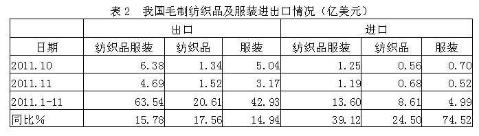 根據(jù)中國海關(guān)的統(tǒng)計數(shù)據(jù),我國2011年1-11月份毛制紡織品及服裝出口總額63.54億美元,同比增加15.78%,占紡織品及服裝出口總額2318.44億美元的2.74%;其中1-11月份毛制紡織品出口總額20.61億美元,同比增加17.56%,占紡織品出口總額920.61億美元的2.24%;1-11月份毛制服裝出口總額42.93億美元,同比增加14.94%,占服裝出口總額1397.82億美元的3.07%;