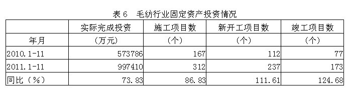 據(jù)國家統(tǒng)計局公布的數(shù)據(jù),2011年1-11月份毛紡行業(yè)實際完成投資額99.74億元,同比增加73.83%;當(dāng)年以來到目前為止施工項目總數(shù)為312個,同比增加86.83%;其中新開工項目數(shù)237個,同比增加111.61%;截至11月底為止,已實現(xiàn)竣工項目數(shù)173個,同比增加124.68%,占施工項目總數(shù)的55.45%,表明該行業(yè)投資項目進展較好。