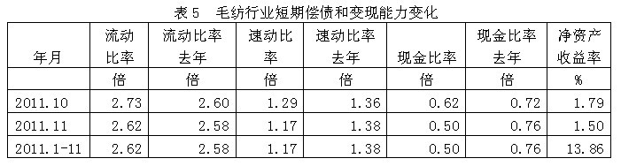 從短期償債和變現(xiàn)能力的變化看,毛紡行業(yè)流動比率(流動資產(chǎn)/流動負(fù)債)2011年1-11月份為2.62倍,而上年同期為2.58倍,流動比率較高,表明企業(yè)短期償債能力較強;