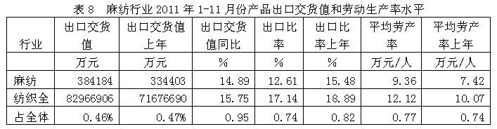 從行業(yè)產(chǎn)品出口交貨值和勞動(dòng)生產(chǎn)率水平看,2011年1-11月份麻紡行業(yè)產(chǎn)品出口交貨值為38.42億元,占紡織全行業(yè)的0.46%;出口交貨值比上年同期增加14.89%;該行業(yè)產(chǎn)品出口比率(出口交貨值/工業(yè)銷(xiāo)售產(chǎn)值)為12.61%,而上年同期為15.48%,表明該行業(yè)產(chǎn)品出口狀況較好;從勞動(dòng)生產(chǎn)率的水平看,2011年1-11月份麻紡行業(yè)平均勞產(chǎn)率(工業(yè)增加值/從業(yè)人數(shù))為9.36萬(wàn)元/人,而上年同期為7.42萬(wàn)元/人,表明該行業(yè)勞動(dòng)生產(chǎn)率的實(shí)際水平比較理想。