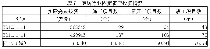 據(jù)國(guó)家統(tǒng)計(jì)局公布的數(shù)據(jù),2011年1-11月份麻紡行業(yè)實(shí)際完成投資額49.89億元,同比增加63.40%;當(dāng)年以來(lái)到目前為止施工項(xiàng)目總數(shù)為137個(gè),同比增加53.93%;其中新開(kāi)工項(xiàng)目數(shù)103個(gè),同比增加60.94%;截至11月底為止,已實(shí)現(xiàn)竣工項(xiàng)目數(shù)76個(gè),同比增加76.74%,占施工項(xiàng)目總數(shù)的55.47%,表明該行業(yè)投資項(xiàng)目進(jìn)展較好。