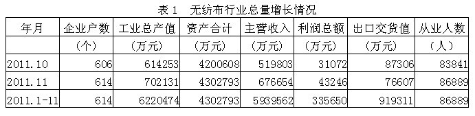 2011年1-11月無紡布行業(yè)經(jīng)濟運行分析