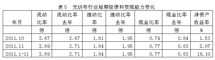 無紡布行業(yè)資產(chǎn)負債率2011年1-11月份為51.54%,表明財務政策的運作比較穩(wěn)健;凈資產(chǎn)收益率為16.10%,表明該行業(yè)凈資產(chǎn)運作效率較高。