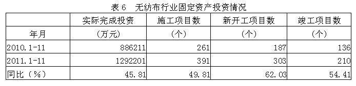 據(jù)國家統(tǒng)計局公布的數(shù)據(jù),2011年1-11月份無紡布行業(yè)實際完成投資額129.22億元,同比增加45.81%;當年以來到目前為止施工項目總數(shù)為391個,同比增加49.81%;其中新開工項目數(shù)303個,同比增加62.03%;截至11月底為止,已實現(xiàn)竣工項目數(shù)210個,同比增加54.41%,占施工項目總數(shù)的53.71%,表明該行業(yè)投資項目進展較好。