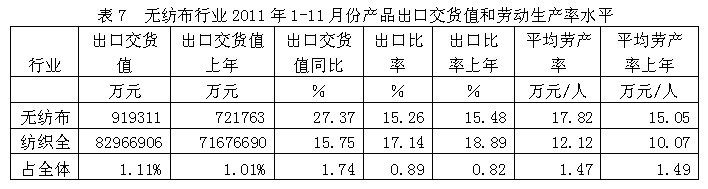 從行業(yè)產(chǎn)品出口交貨值和勞動生產(chǎn)率水平看,2011年1-11月份無紡布行業(yè)產(chǎn)品出口交貨值為91.93億元,占紡織全行業(yè)的1.11%;出口交貨值比上年同期增加27.37%;該行業(yè)產(chǎn)品出口比率(出口交貨值/工業(yè)銷售產(chǎn)值)為15.26%,而上年同期為15.48%,表明該行業(yè)產(chǎn)品出口狀況較好;從勞動生產(chǎn)率的水平看,2011年1-11月份無紡布行業(yè)平均勞產(chǎn)率(工業(yè)增加值/從業(yè)人數(shù))為17.82萬元/人,而上年同期為15.05萬元/人,表明該行業(yè)勞動生產(chǎn)率的實際水平比較理想。