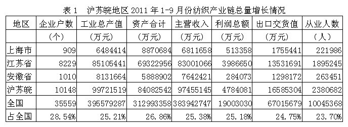 據(jù)國(guó)家統(tǒng)計(jì)局公布的數(shù)據(jù),2011年1-9月份我國(guó)滬蘇皖兩省一市(上海市、江蘇省、安徽?。┘徔棶a(chǎn)業(yè)鏈(從紡織上游原料到下游服裝)規(guī)模以上企業(yè)數(shù)量為10148家,占全國(guó)總數(shù)的28.54%;工業(yè)總產(chǎn)值為9972.15億元,占25.21%;資產(chǎn)合計(jì)為8408.25億元,占26.86%;主營(yíng)收入為9745.51億元,占25.38%;利潤(rùn)總額為478.41億元,占25.18%;出口交貨值為1658.53億元,占24.75%;從業(yè)人數(shù)為238.07萬(wàn)人,占23.70%。由此可見,滬蘇皖地區(qū)紡織產(chǎn)業(yè)鏈總產(chǎn)值、總資產(chǎn)、主營(yíng)收入、利潤(rùn)總額、出口和就業(yè)均給全國(guó)作出了巨大的貢獻(xiàn)。