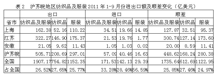 我國(guó)滬蘇皖三地2011年1-9月份紡織品及服裝出口額為505.71億美元,占全國(guó)紡織品服裝出口總額的26.52%,其中紡織品出口額為208.69億美元,占全國(guó)27.65%,服裝出口額為297.01億美元,占全國(guó)25.77%;在進(jìn)口方面,滬蘇皖三地紡織品及服裝進(jìn)口額為57.09億美元,占全國(guó)紡織品服裝進(jìn)口總額的33.28%,其中紡織品進(jìn)口額為40.46億美元,占全國(guó)28.46%,服裝進(jìn)口額為16.63億美元,占全國(guó)56.59%;顯示我國(guó)滬蘇皖地區(qū)紡織品服裝出口總額遠(yuǎn)高于進(jìn)口總額,順差明顯,表明該地區(qū)紡織品服裝在國(guó)際市場(chǎng)上競(jìng)爭(zhēng)力較強(qiáng)。