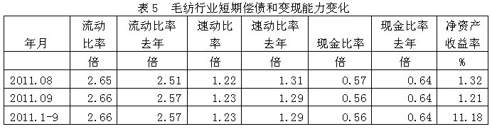 從短期償債和變現(xiàn)能力的變化看,毛紡行業(yè)流動(dòng)比率(流動(dòng)資產(chǎn)/流動(dòng)負(fù)債)2011年1-9月份為2.66倍,而上年同期為2.57倍,流動(dòng)比率較高,表明企業(yè)短期償債能力較強(qiáng);