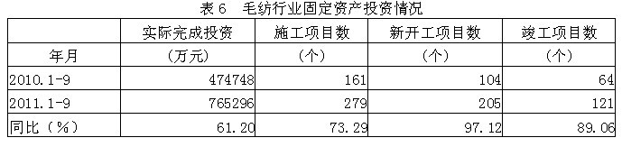 據(jù)國(guó)家統(tǒng)計(jì)局公布的數(shù)據(jù),2011年1-9月份毛紡行業(yè)實(shí)際完成投資額76.53億元,同比增加61.20%;當(dāng)年以來到目前為止施工項(xiàng)目總數(shù)為279個(gè),同比增加73.29%;其中新開工項(xiàng)目數(shù)205個(gè),同比增加97.12%;截至9月底為止,已實(shí)現(xiàn)竣工項(xiàng)目數(shù)121個(gè),同比增加89.06%,占施工項(xiàng)目總數(shù)的43.37%,表明該行業(yè)投資項(xiàng)目進(jìn)展較好。
