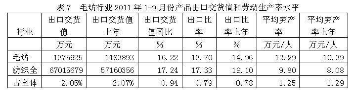 7毛紡行業(yè)產(chǎn)品出口交貨值和勞動(dòng)生產(chǎn)率水平