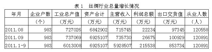 據(jù)國(guó)家統(tǒng)計(jì)局公布的數(shù)據(jù),2011年1-9月份我國(guó)規(guī)模以上絲綢行業(yè)企業(yè)數(shù)量為983家,該行業(yè)實(shí)現(xiàn)工業(yè)總產(chǎn)值601.30億元,同比增加25.41%;資產(chǎn)合計(jì)692.51億元,同比增加25.13%;實(shí)現(xiàn)主營(yíng)收入592.85億元,同比增加25.70%;完成利潤(rùn)總額21.55億元,比上年同期增加5.67億元,同比增加35.69%;完成出口交貨值85.4億元,同比增加23.11%;行業(yè)整體從業(yè)人數(shù)12.09萬(wàn)人,同比增加2.63%。由此可見(jiàn),絲綢行業(yè)總量增長(zhǎng)勢(shì)頭良好,并為我國(guó)經(jīng)濟(jì)、財(cái)政、出口和就業(yè)作出了重大的貢獻(xiàn)。