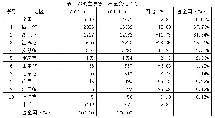 全國(guó)絲綢2011年1-9月份產(chǎn)量合計(jì)為4.46億米,比上年同期減少2.32%;其中產(chǎn)量最大的省市是四川省,產(chǎn)量為1.68億米,為省市龍頭;其次是浙江省,產(chǎn)量1.41億米,位居亞軍;然后是江蘇省,產(chǎn)量0.72億米,榮立第三;安徽省0.37億米,為第四;重慶市0.11億米,占第五;山東省0.06億米,位居第六;接下來(lái)是遼寧省0.05億米,為第七;廣西0.04億米,占第八;江西省0.01億米,位居第九;上海市0.01億米,為第十名;上述10大省市2011年1-9月份產(chǎn)量合計(jì)為4.46億米,占全國(guó)2011年1-9月份總產(chǎn)量的100.00%。