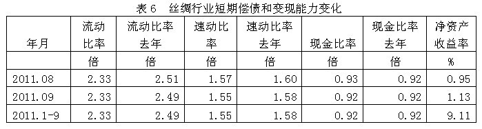 從短期償債和變現(xiàn)能力的變化看,絲綢行業(yè)流動(dòng)比率(流動(dòng)資產(chǎn)/流動(dòng)負(fù)債)2011年1-9月份為2.33倍,而上年同期為2.49倍,流動(dòng)比率較高,表明企業(yè)短期償債能力較強(qiáng);
