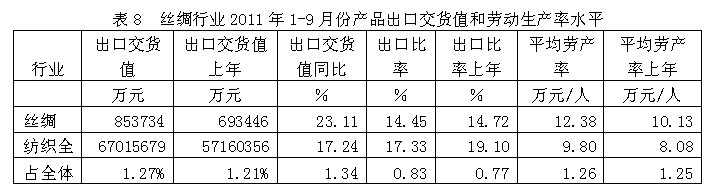 從行業(yè)產(chǎn)品出口交貨值和勞動(dòng)生產(chǎn)率水平看,2011年1-9月份絲綢行業(yè)產(chǎn)品出口交貨值為85.37億元,占紡織全行業(yè)的1.27%;出口交貨值比上年同期增加23.11%;該行業(yè)產(chǎn)品出口比率(出口交貨值/工業(yè)銷(xiāo)售產(chǎn)值)為14.45%,而上年同期為14.72%,表明該行業(yè)產(chǎn)品出口狀況較好;從勞動(dòng)生產(chǎn)率的水平看,2011年1-9月份絲綢行業(yè)平均勞產(chǎn)率(工業(yè)增加值/從業(yè)人數(shù))為12.38萬(wàn)元/人,而上年同期為10.13萬(wàn)元/人,表明該行業(yè)勞動(dòng)生產(chǎn)率的實(shí)際水平較為理想。