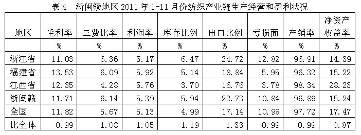 從生產(chǎn)經(jīng)營和盈利狀況看,浙閩贛紡織產(chǎn)業(yè)鏈毛利率2011年1-11月份為11.71%,為全國平均數(shù)的0.99倍,三費(fèi)比率(營業(yè)、管理和財(cái)務(wù)費(fèi)用率之和)為6.14%,為全國平均數(shù)的1.08倍,利潤率為5.39%,為全國平均數(shù)的1.05倍;庫存比率為5.94%,為全國平均數(shù)的1.19倍;出口比例為22.73%,為全國平均數(shù)的1.33倍;企業(yè)虧損面為10.84%,為全國平均數(shù)的0.99倍。由此可見,浙閩贛地區(qū)的盈利狀況接近于全國紡織產(chǎn)業(yè)鏈的平均水平。