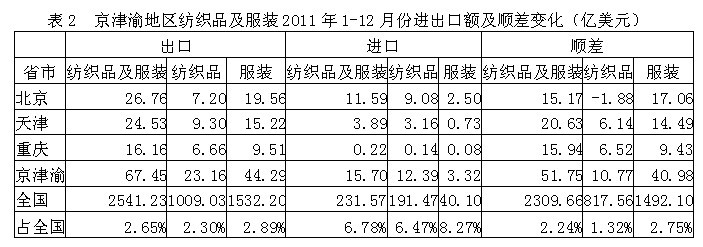 2 京津渝紡織品服裝進(jìn)出口變化