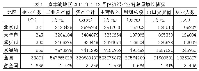 據(jù)國(guó)家統(tǒng)計(jì)局公布的數(shù)據(jù),2011年1-12月份我國(guó)京津渝三大城市(北京市、天津市、重慶市)紡織產(chǎn)業(yè)鏈(從紡織上游原料到下游服裝)規(guī)模以上企業(yè)數(shù)量為666家,占全國(guó)總數(shù)的1.86%;工業(yè)總產(chǎn)值為787.40億元,占1.44%;資產(chǎn)合計(jì)為741.13億元,占2.25%;主營(yíng)收入為815.10億元,占1.53%;利潤(rùn)總額為49.15億元,占1.66%;出口交貨值為165.70億元,占1.81%;從業(yè)人數(shù)為24.60萬人,占2.40%。由此可見,京津渝地區(qū)紡織產(chǎn)業(yè)鏈總產(chǎn)值、總資產(chǎn)、主營(yíng)收入、利潤(rùn)總額、出口和就業(yè)均給全國(guó)作出了一定的貢獻(xiàn)。