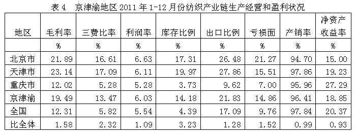 從生產(chǎn)經(jīng)營(yíng)和盈利狀況看,京津渝紡織產(chǎn)業(yè)鏈毛利率2011年1-12月份為19.49%,為全國(guó)平均數(shù)的1.58倍,三費(fèi)比率(營(yíng)業(yè)、管理和財(cái)務(wù)費(fèi)用率之和)為13.47%,為全國(guó)平均數(shù)的2.32倍,利潤(rùn)率為6.03%,為全國(guó)平均數(shù)的1.09倍;庫存比率為14.18%,為全國(guó)平均數(shù)的3.23倍;出口比例為21.83%,為全國(guó)平均數(shù)的1.28倍;企業(yè)虧損面為14.86%,為全國(guó)平均數(shù)的1.52倍。由此可見,京津渝地區(qū)的盈利狀況接近于全國(guó)紡織產(chǎn)業(yè)鏈的平均水平。