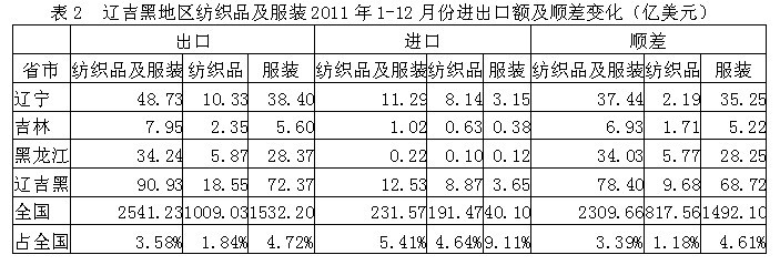 我國遼吉黑三省2011年1-12月份紡織品及服裝出口額為90.93億美元,占全國紡織品服裝出口總額的3.58%,其中紡織品出口額為18.55億美元,占全國1.84%,服裝出口額為72.37億美元,占全國4.72%;在進口方面,遼吉黑三省紡織品及服裝進口額為12.53億美元,占全國紡織品服裝進口總額的5.41%,其中紡織品進口額為8.87億美元,占全國4.64%,服裝進口額為3.65億美元,占全國9.11%;顯示我國遼吉黑地區(qū)紡織品服裝出口總額遠高于進口總額,順差明顯,表明該地區(qū)紡織品服裝在國際市場上競爭力較強。