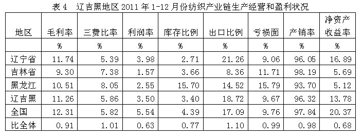 從生產(chǎn)經(jīng)營和盈利狀況看,遼吉黑紡織產(chǎn)業(yè)鏈毛利率2011年1-12月份為11.26%,為全國平均數(shù)的0.91倍,三費比率(營業(yè)、管理和財務費用率之和)為5.86%,為全國平均數(shù)的1.01倍,利潤率為3.50%,為全國平均數(shù)的0.63倍;庫存比率為3.40%,為全國平均數(shù)的0.77倍;出口比例為18.72%,為全國平均數(shù)的1.10倍;企業(yè)虧損面為9.67%,為全國平均數(shù)的0.99倍。由此可見,遼吉黑地區(qū)的盈利狀況接近于全國紡織產(chǎn)業(yè)鏈的平均水平。