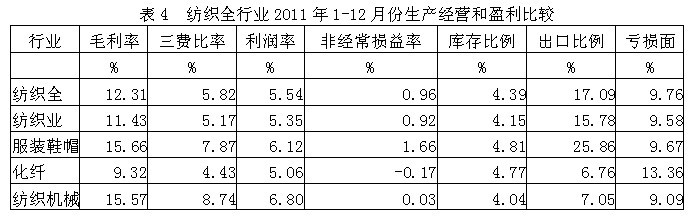 從企業(yè)生產(chǎn)經(jīng)營和盈利狀況看,紡織全行業(yè)毛利率2011年1-12月份為12.31%,三費比率(營業(yè)、管理和財務(wù)費用率之和)為5.82%,利潤率為5.54%,如果剔除非經(jīng)常性損益的影響,名義稅前利潤率為6.49%;該行業(yè)庫存比率為4.39%,表明產(chǎn)品銷售正常;出口比例為17.09%,表明出口狀況較好;該行業(yè)虧損面為9.76%。由此可見,在紡織全行業(yè)中,生產(chǎn)經(jīng)營狀況運作得較好。