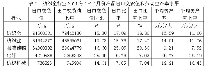 7紡織全行業(yè)產(chǎn)品出口交貨值和勞動生產(chǎn)率水平