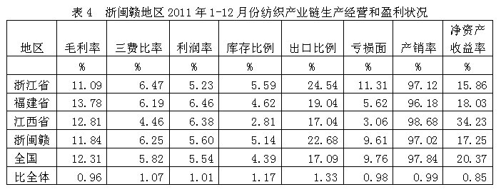 從生產(chǎn)經(jīng)營(yíng)和盈利狀況看,浙閩贛紡織產(chǎn)業(yè)鏈毛利率2011年1-12月份為11.84%,為全國(guó)平均數(shù)的0.96倍,三費(fèi)比率(營(yíng)業(yè)、管理和財(cái)務(wù)費(fèi)用率之和)為6.25%,為全國(guó)平均數(shù)的1.07倍,利潤(rùn)率為5.60%,為全國(guó)平均數(shù)的1.01倍;庫(kù)存比率為5.14%,為全國(guó)平均數(shù)的1.17倍;出口比例為22.68%,為全國(guó)平均數(shù)的1.33倍;企業(yè)虧損面為9.61%,為全國(guó)平均數(shù)的0.98倍。由此可見(jiàn),浙閩贛地區(qū)的盈利狀況接近于全國(guó)紡織產(chǎn)業(yè)鏈的平均水平。