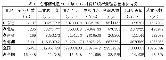 據(jù)國(guó)家統(tǒng)計(jì)局公布的數(shù)據(jù),2011年1-12月份我國(guó)魯鄂湘三?。ㄉ綎|省、湖北省、湖南?。┘徔棶a(chǎn)業(yè)鏈(從紡織上游原料到下游服裝)規(guī)模以上企業(yè)數(shù)量為5901家,占全國(guó)總數(shù)的16.44%;工業(yè)總產(chǎn)值為11693.07億元,占21.34%;資產(chǎn)合計(jì)為5127.41億元,占15.54%;主營(yíng)收入為11582.31億元,占21.69%;利潤(rùn)總額為667.67億元,占22.58%;出口交貨值為1367.06億元,占14.92%;從業(yè)人數(shù)為193.40萬人,占18.84%。由此可見,魯鄂湘地區(qū)紡織產(chǎn)業(yè)鏈總產(chǎn)值、總資產(chǎn)、主營(yíng)收入、利潤(rùn)總額、出口和就業(yè)均給全國(guó)作出了巨大的貢獻(xiàn)。