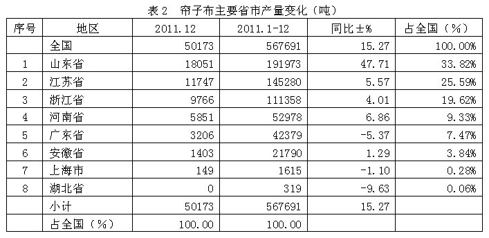 全國簾子布2011年1-12月份產(chǎn)量合計為56.77萬噸,比上年同期增加15.27%;其中產(chǎn)量最大的省市是山東省,產(chǎn)量為19.20萬噸,為省市龍頭;其次是江蘇省,產(chǎn)量14.53萬噸,位居亞軍;然后是浙江省,產(chǎn)量11.14萬噸,榮立第三;河南省5.30萬噸,為第四;廣東省4.24萬噸,占第五;安徽省2.18萬噸,位居第六;接下來是上海市0.16萬噸,為第七;湖北省0.03萬噸,占第八;上述8大省市2011年1-12月份產(chǎn)量合計為56.77萬噸,占全國2011年1-12月份總產(chǎn)量的100.00%。