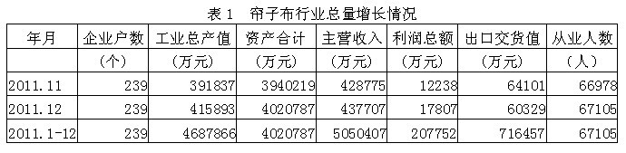 據(jù)國家統(tǒng)計局公布的數(shù)據(jù),2011年1-12月份我國規(guī)模以上簾子布行業(yè)上下游企業(yè)數(shù)量為239家,該行業(yè)實現(xiàn)工業(yè)總產(chǎn)值468.79億元,同比增加22.28%;資產(chǎn)合計402.08億元,同比減少4.02%;實現(xiàn)主營收入505.04億元,同比增加23.19%;完成利潤總額20.78億元,比上年同期增加2.25億元,同比增加12.14%;完成出口交貨值71.6億元,同比增加36.50%;行業(yè)整體從業(yè)人數(shù)6.71萬人,同比增加5.12%。由此可見,簾子布行業(yè)總量增長勢頭良好,并為我國經(jīng)濟、財政、出口和就業(yè)作出了重大的貢獻。
