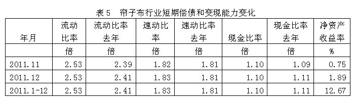 從短期償債和變現(xiàn)能力的變化看,簾子布行業(yè)流動比率(流動資產(chǎn)/流動負債)2011年1-12月份為2.53倍,而上年同期為2.41倍,流動比率較高,表明企業(yè)短期償債能力較強;
