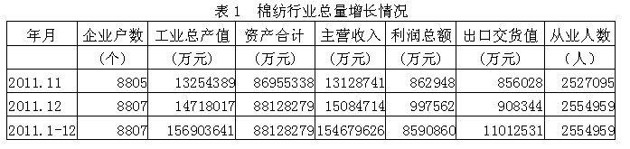 據(jù)國(guó)家統(tǒng)計(jì)局公布的數(shù)據(jù),2011年1-12月份我國(guó)規(guī)模以上棉紡行業(yè)企業(yè)數(shù)量為8807家,該行業(yè)實(shí)現(xiàn)工業(yè)總產(chǎn)值15690億元,同比增加29.67%;資產(chǎn)合計(jì)8813億元,同比增加17.19%;實(shí)現(xiàn)主營(yíng)收入15468億元,同比增加29.47%;完成利潤(rùn)總額859.09億元,比上年同期增加201.38億元,同比增加30.62%;完成出口交貨值1101.3億元,同比增加10.41%;行業(yè)整體從業(yè)人數(shù)255.50萬人,同比增加6.55%。由此可見,棉紡行業(yè)總量增長(zhǎng)勢(shì)頭良好,并為我國(guó)經(jīng)濟(jì)、財(cái)政、出口和就業(yè)作出了重大的貢獻(xiàn)。