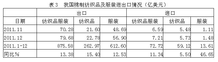 根據(jù)中國(guó)海關(guān)的統(tǒng)計(jì)數(shù)據(jù),我國(guó)2011年1-12月份棉制紡織品及服裝出口總額875.58億美元,同比增加13.38%,占紡織品及服裝出口總額2541.23億美元的34.45%;其中1-12月份棉制紡織品出口總額262.97億美元,同比增加15.40%,占紡織品出口總額1009.03億美元的26.06%;1-12月份棉制服裝出口總額612.60億美元,同比增加12.53%,占服裝出口總額1532.20億美元的39.98%;