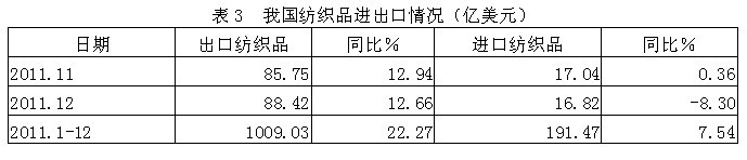 根據(jù)中國海關(guān)的統(tǒng)計數(shù)據(jù),我國2011年1-12月份紡織品出口總額1009.03億美元,同比增加22.27%,占紡織品及服裝出口總額2541.23億美元的39.71%;1-12月份紡織品進(jìn)口總額191.47億美元,同比增加7.54%,占紡織品及服裝進(jìn)口總額231.57億美元的82.68%;顯示中國紡織品外貿(mào)形勢較好。