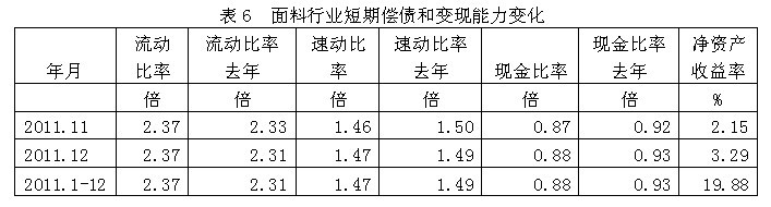 從短期償債和變現(xiàn)能力的變化看,面料行業(yè)流動比率(流動資產(chǎn)/流動負(fù)債)2011年1-12月份為2.37倍,而上年同期為2.31倍,流動比率較高,表明企業(yè)短期償債能力較強(qiáng);