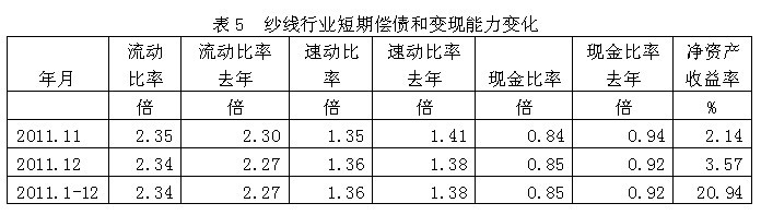 從短期償債和變現(xiàn)能力的變化看,紗線行業(yè)流動(dòng)比率(流動(dòng)資產(chǎn)/流動(dòng)負(fù)債)2011年1-12月份為2.34倍,而上年同期為2.27倍,流動(dòng)比率較高,表明企業(yè)短期償債能力較強(qiáng);