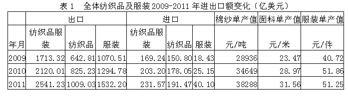 我國全體紡織品服裝出口額從2009年1713.32億美元改變至2011年2541.23億美元,增加48.32%;其中紡織品出口額從642.81億美元改變至1009.03億美元,增加56.97%;服裝出口額從1070.51億美元改變至1532.20億美元,增加43.13%;在進口方面,全體紡織品服裝進口額從169.24億美元改變至231.57億美元,增加36.83%;其中紡織品進口額從150.80億美元改變至191.47億美元,增加26.97%;服裝進口額從18.43億美元改變至40.10億美元,增加117.52%;顯示全體紡織品服裝出口遠高于進口,順差明顯,表明我國全體紡織品服裝在國際市場上競爭力較強。