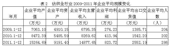 從企業(yè)平均規(guī)模的變化情況看,紡織全行業(yè)企業(yè)平均產(chǎn)值從2009年的7063萬元改變至2011年的15265萬元,增加116.12%;企業(yè)平均資產(chǎn)從4910萬元改變至9191萬元,增加87.19%;企業(yè)平均主營收入從6795萬元改變至14878萬元,增加118.94%;企業(yè)平均利潤從274.23萬元改變至823.72萬元,增加200.38%;企業(yè)平均出口交貨值從1386萬元改變至2552萬元,增加84.18%;企業(yè)平均人數(shù)從204人改變至286人,增加40.27%。由此可見,紡織全行業(yè)在近幾年的結(jié)構(gòu)調(diào)整過程中,企業(yè)平均規(guī)模有所變化,行業(yè)的發(fā)展勢頭較為健康。