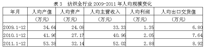 從行業(yè)人均規(guī)模的變化情況看,紡織全行業(yè)人均產(chǎn)值從2009年的34.64萬元改變至2011年的53.38萬元,增加54.07%;行業(yè)人均資產(chǎn)從24.08萬元改變至32.14萬元,增加33.45%;行業(yè)人均主營收入從33.33萬元改變至52.02萬元,增加56.08%;行業(yè)人均利潤從1.35萬元改變至2.88萬元,增加114.14%;行業(yè)人均出口交貨值從6.80萬元改變至8.92萬元,增加31.30%。由此可見,紡織全行業(yè)在近幾年的發(fā)展過程中,行業(yè)人均規(guī)模發(fā)生了積極的變化,反映企業(yè)勞動生產(chǎn)率和企業(yè)的綜合競爭力較好。