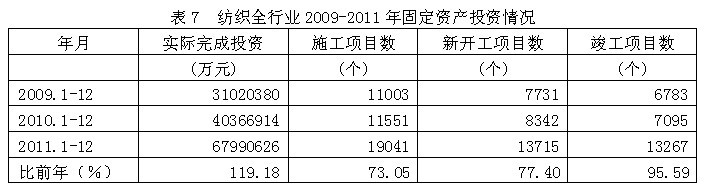 據(jù)國家統(tǒng)計局公布的數(shù)據(jù),我國紡織全行業(yè)實際完成投資額從2009年3102.04億元改變至2011年6799.06億元,增加119.18%;當年施工項目數(shù)從11003個改變至19041個,增加73.05%;其中新開工項目數(shù)從7731個改變至13715個,增加77.40%;截至當年底為止,已實現(xiàn)竣工項目數(shù)從6783個改變至13267個,增加95.59%,表明該行業(yè)投資項目進展狀況較好。